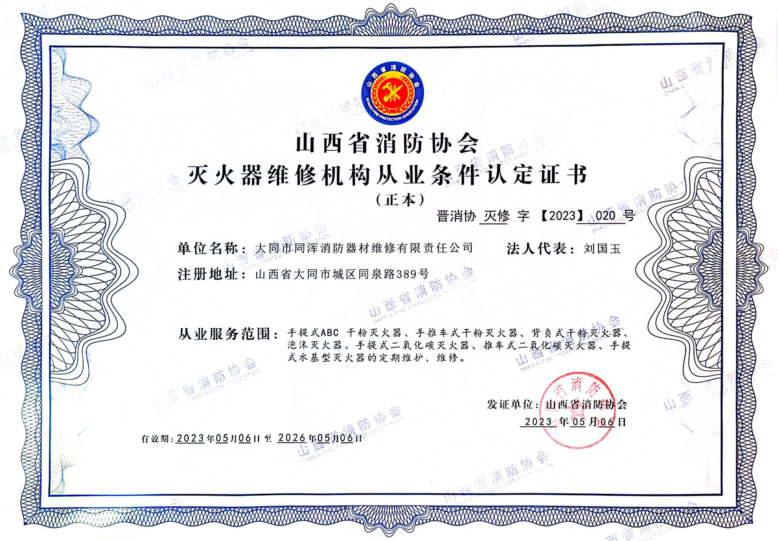 大同市同渾消防器材維修有限責任公司,位于大同市同泉路389號,始建于2000年,是公安部消防局定點銷售和維修的企業,歷經多年的創建、發展和拼搏,現有多家消防器材廠商供應我公司,并有現代化維修設備,標準的廠房,嚴格的管理,優良的設備,良好的服務并受到各行各業的好評??偨浝韯駠栏窆芾恚瑖栏褚?,精益求精,認真負責,帶領團隊熱烈歡迎各界朋友顧客光臨。